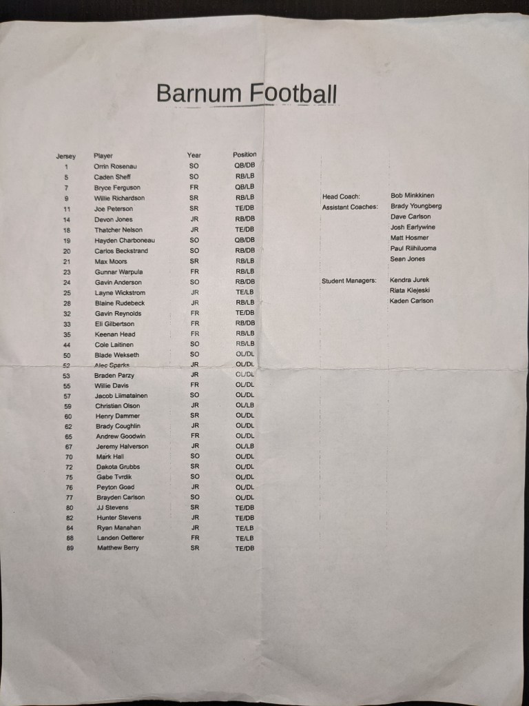 Final Score: Barnum 52 – East Central 0