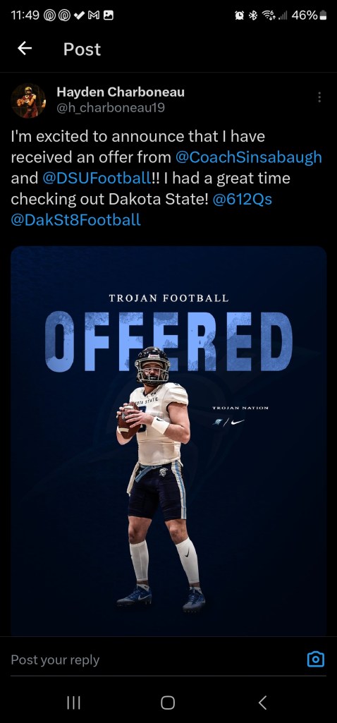 Hayden Charboneau receives 4th offer to play football at Dakota State University